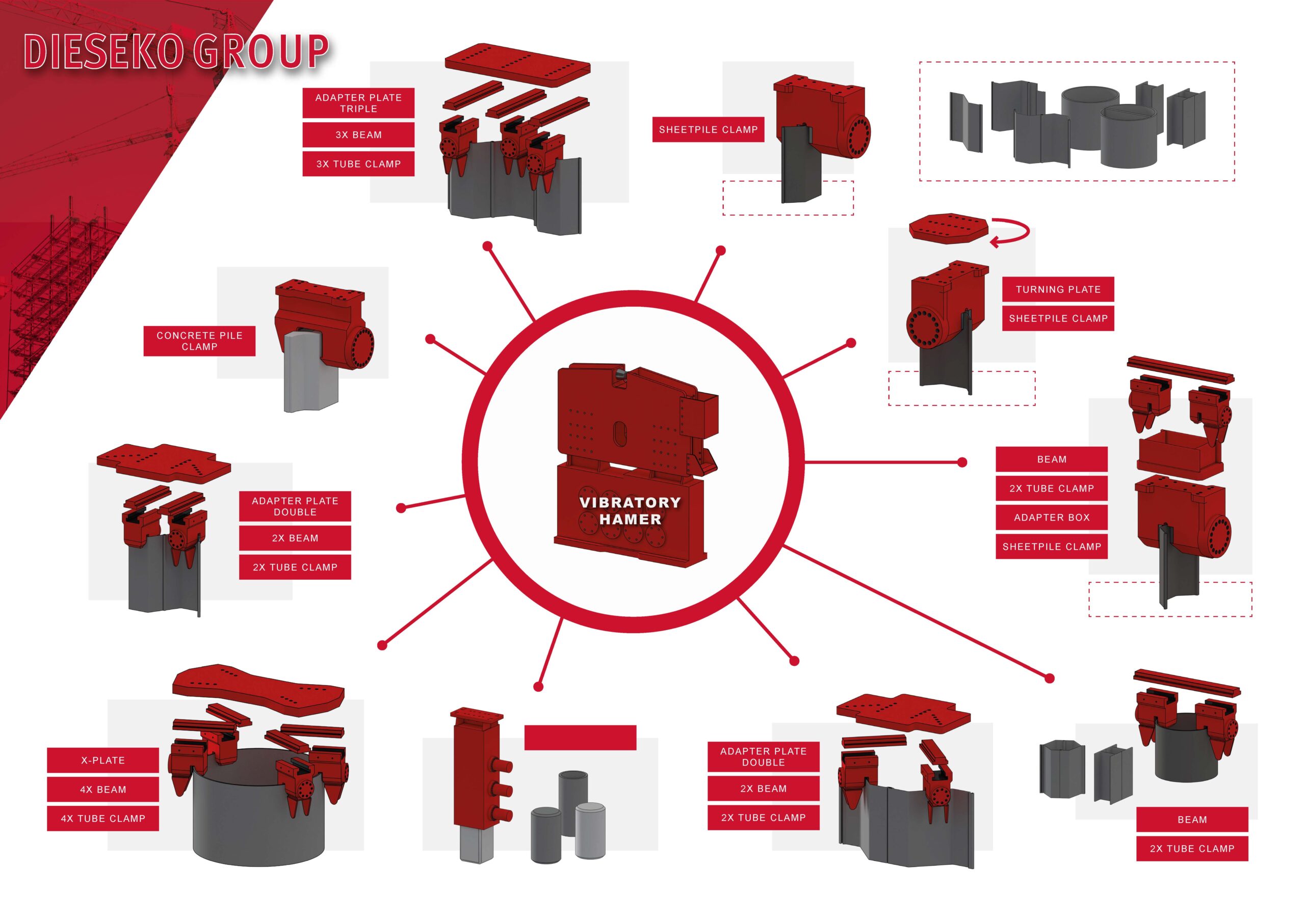 Затискачі є з’єднуючим елементом між віброзанурювачем і профілем. Dieseko Group пропонує широкий ряд затискачів, що відрізняються за затискним зусиллям і вагою. Майже кожен тип профілів може занурюватися чи витягуватися за допомогою відповідних затискачів з цього ряду.